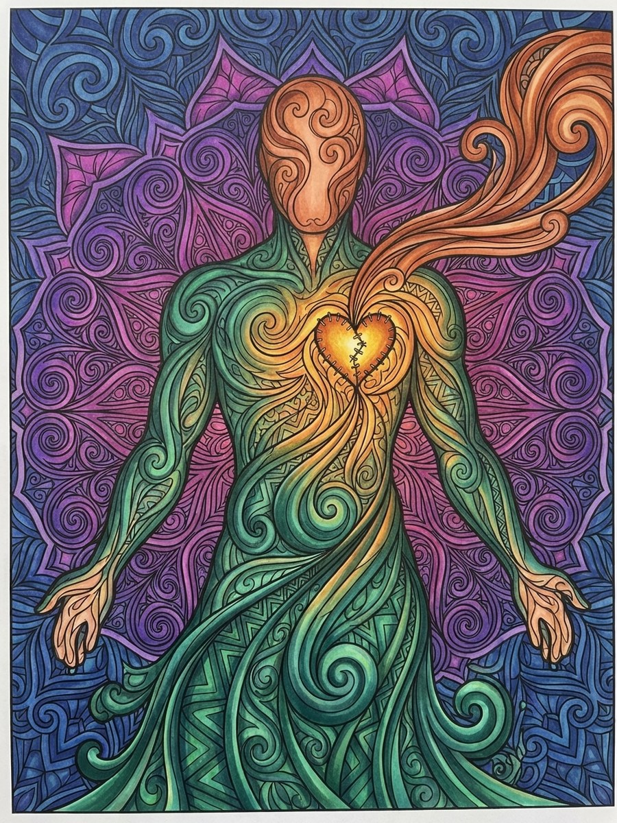 Every page is an illustrated thought-form — a visual metaphor designed to work on you while you color it.